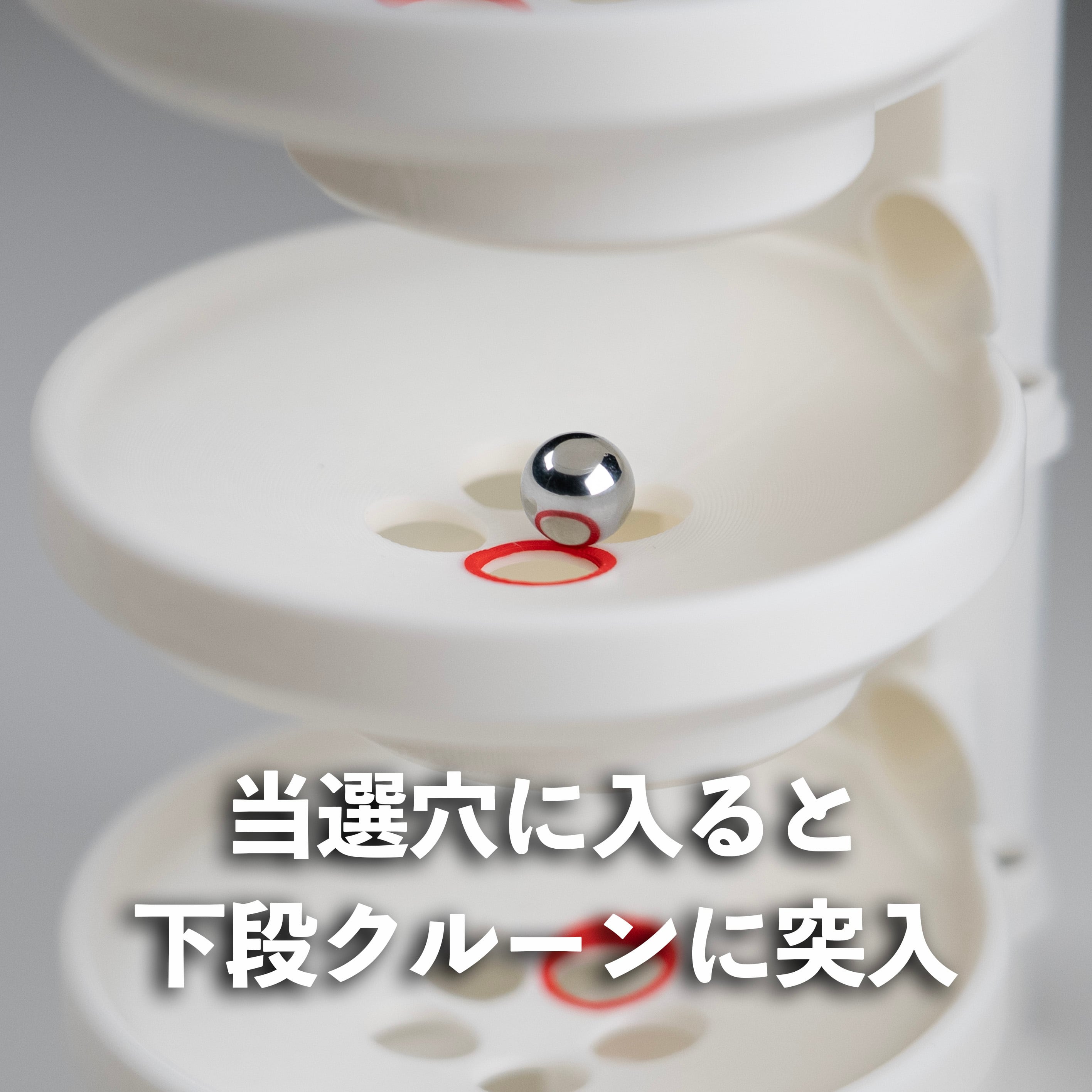 当たり穴に入った玉は下段のクルーンに流れ、ハズレ穴に入った玉は最下段から排出されます。